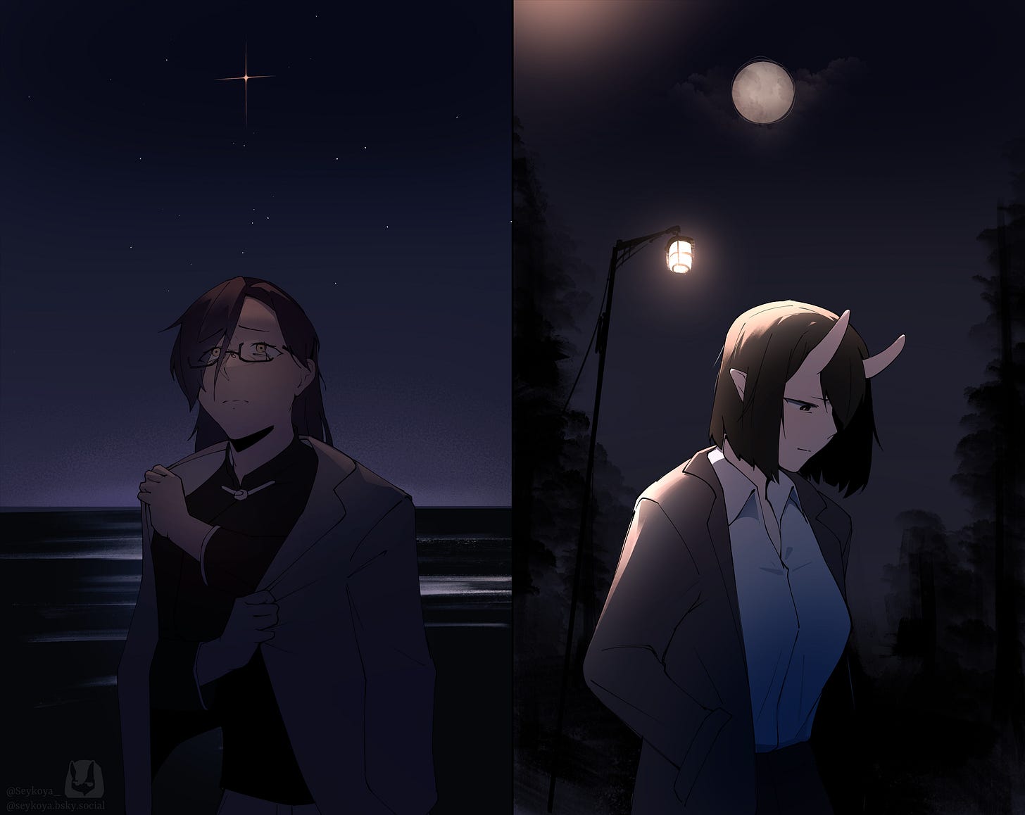 It’s a quiet night on the shore, where the sea and sky meet, where the moon hangs low, where the Oni come to remember, she thinks it might be a fine night for the adrift.